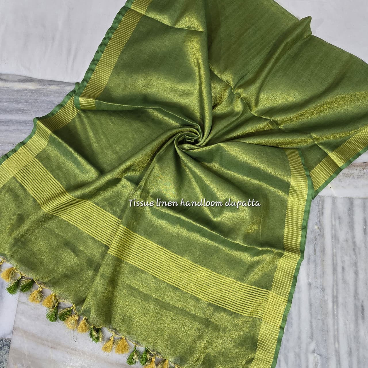 • TISSUE LINEN GOLDEN BORDER DUPATTA  WITH POM POM (2.5 METERS)